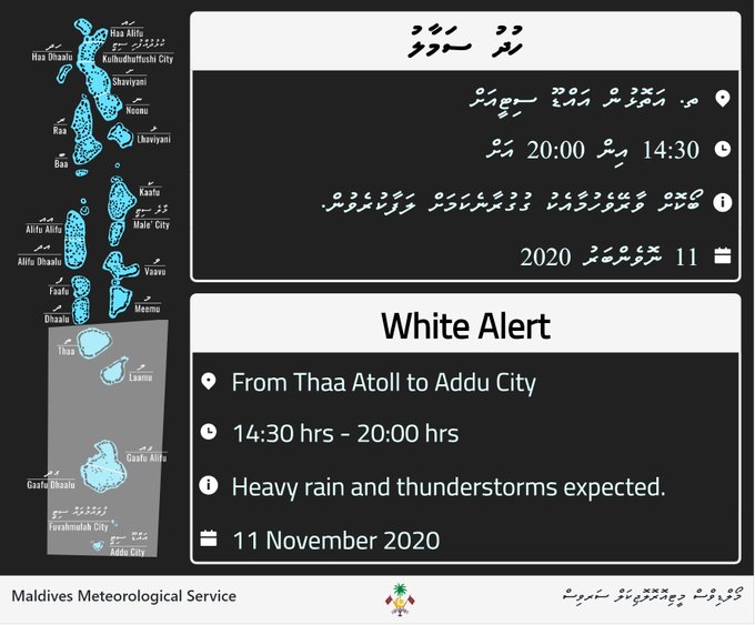 މެޓް އޮފީހުން ނެރެފައިވާ މި އެލާޓްގައި ވިދާޅުވެފައި ވަނީ މިއަދު މެންދުރު ފަހު 2:30 އިން މިރޭ 8:00 އަށް ތ. އަތޮޅުން ފެށިގެން އައްޑޫ ސިޓީއާއި ހަމައަށް ބޯކޮށް ވާރޭ ވެހުމާއެކު ގުގުރާނެ ކަމަށް ލަފާ ކުރެވޭ ކަމަށެވެ.