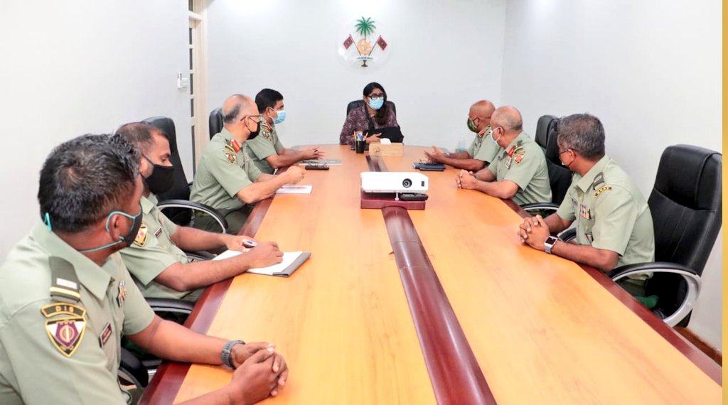 ކައުންޓަރ ޓެރަރިޒަމް ސެންޓަރުގައި ޙަރަކާތްތެރިވުމަށްޓަކައި ސައުދީ އަރަބިއްޔާއަށްދާ ސިފައިންނާއި މިނިސްޓަރ މާރިޔަ ބައްދަލުކުރައްވަނީ : ފޮޓޯ- ޑިފެންސް މިނިސްޓްރީ