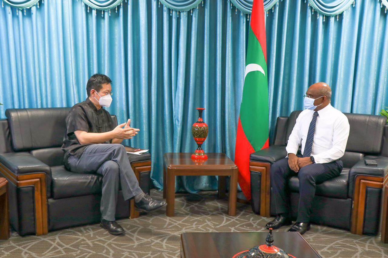 Pleased to meet @AmbassadorZhang today, who informed me that #China will donate a further 100K vaccines to the Maldives, in addition to the 100K pledged already. ???????? thanks ???????? for the support in the #COVID19 vaccination program GoM is undertaking. pic.twitter.com/t6193qSs8t