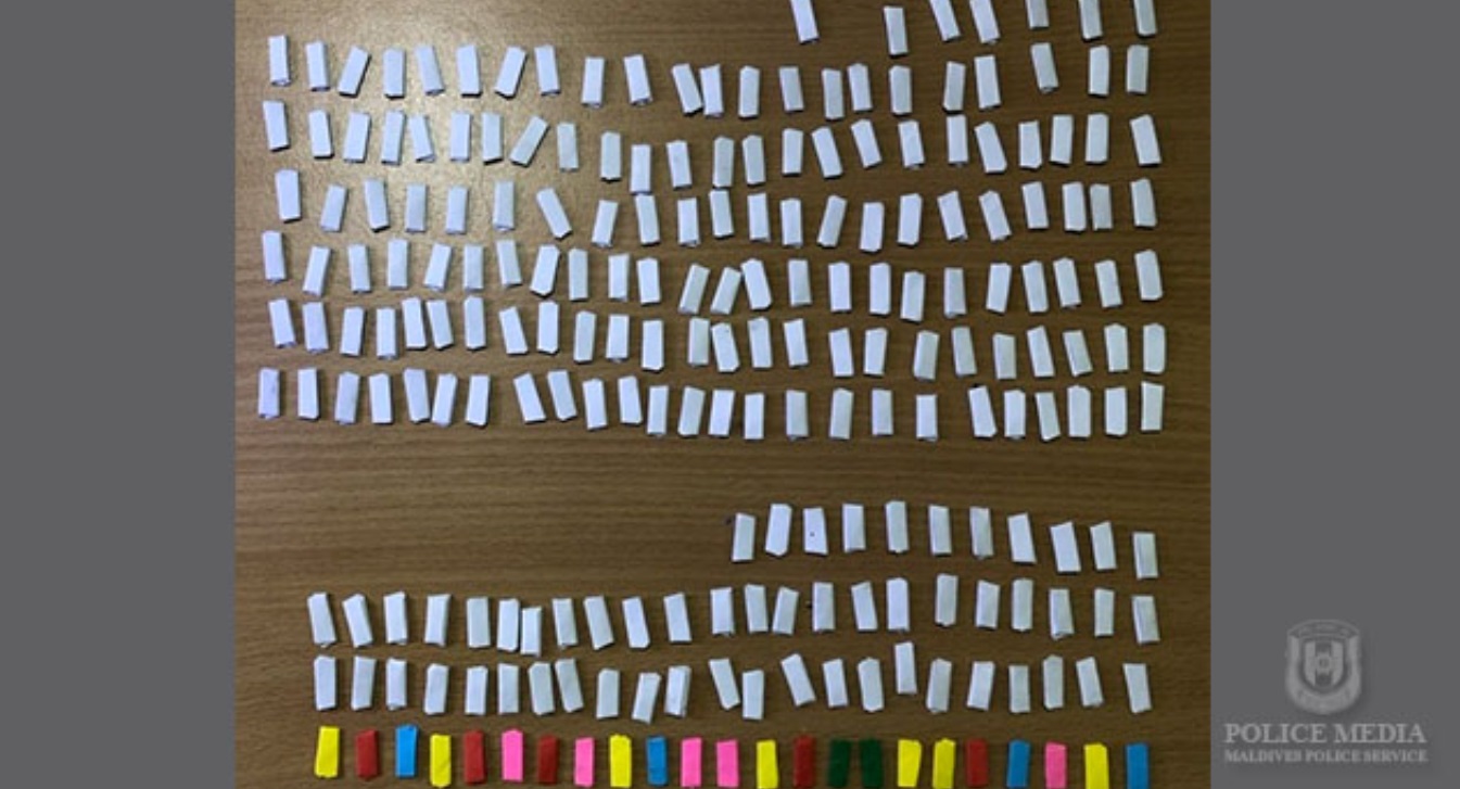 "މިމީހުން ހައްޔަރުކޮށް، މިމީހުން ދިރިއުޅޭ ގެ ކޯޓުއަމުރެއްގެ ދަށުން ބަލައިފާސްކުރިއިރު މަސްތުވާތަކެތިކަމަށް ޝައްކުކުރެވޭ އެއްޗެއްހުރި 230 ކަރުދާސްކޮޅާއި މަސްތުވާތަކެތިކަމަށް ޝައްކުކުރެވޭ އެއްޗެއްހުރި ފަސް ރަބަރު ޕެކެޓު ފެނިފައިވޭ." ފުލުހުން ވިދާޅުވިއެވެ.