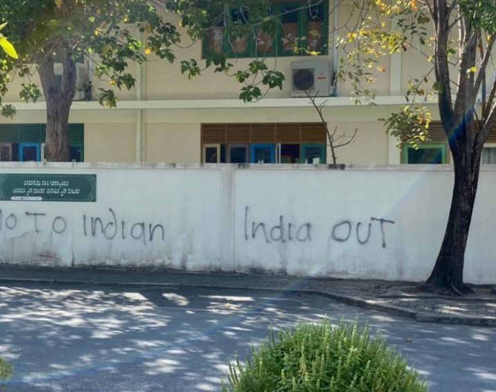 ގިނަ އަދަދެއްގެ އިންޑިއާ ޓީޗަރުން ކިޔަވައިދެމުންދާ ފުނަދޫ ސްކޫލުގެ ފާރުގައި އިންޑިއާ ބޭރުކުރުމަށް ގޮވާލާ އެކި އެއްޗެހި ކަޅު ކުލައިން ސްޕްރޭ ކޮށްފައި ހުއްޓެވެ. ސްކޫލު ފާރުގައި މިހެން ލިޔެފައި މިވަނީ ދެވަނަ ޓާމުގެ ޗުއްޓީ ބަންދަށް ފަހު މިއަދު އަލުން ސްކޫލު ހުޅުވާ ދުވަހާއި ދިމާކޮށެވެ.