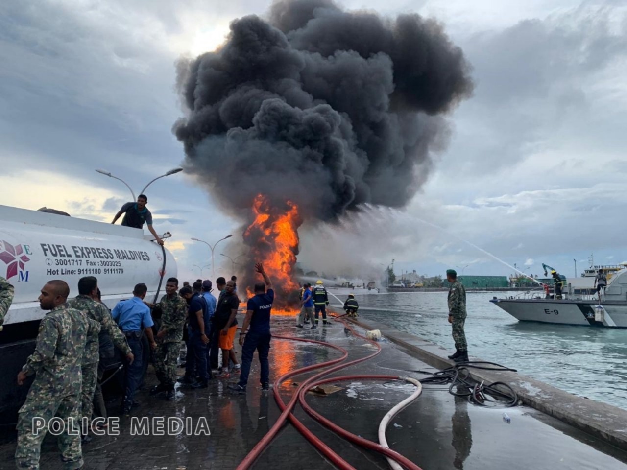 16:05 ލޯންޗުގައި ރޯވި އަލިފާންގަނޑުގެ ސަބަބުން އެސަރަހައްދުގައި އޮތް ތެޔޮ ބައުޒަރުތަކުގައި އަލިފާން ރޯވެފައިވާއިރު، އަލިފާން ނިއްވުމަށް ފޯމު ޖެހުމުގެ މަސައަކަތް ސިފައިން ދަނީ ކުރަމުން.