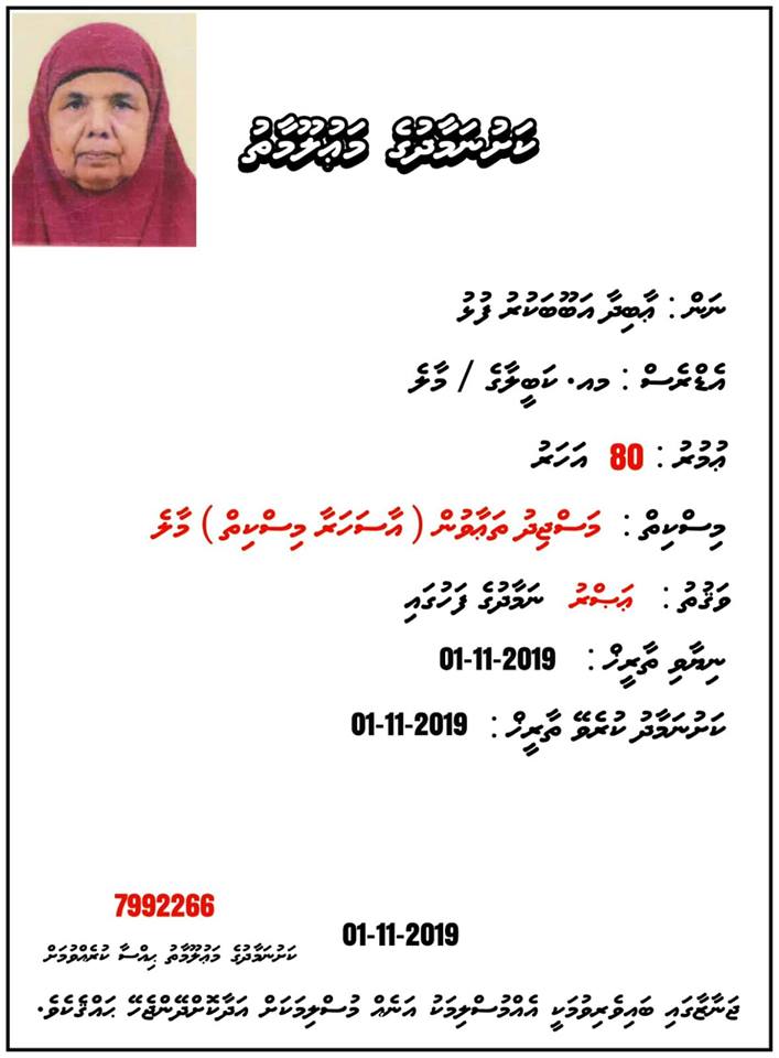 ނަހުލާގެ މަންމަ ޢާބިދާ އަބޫބަކުރު ފުޅު / މއ. ކަބީލާގެ، ނިޔާވި އިރު އުމުރަކީ 80 އަހަރެވެ.