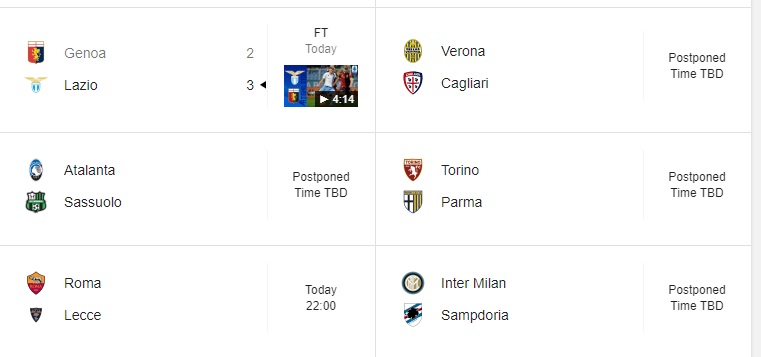 މީގެއިތުރުން އިޓަލީގައި ކުޅުމަށް ހަމަޖެހިފައިވާ ގިނަ މެޗުތަކެއް ކެންސަލްކޮށްފައިވާއިރު، އިއްޔެވެސްވަނީ ސީރީއާ ބީ ގައި ކުޅެން ހަމަޖެހިފައިވާ 42 މެޗެއް ކެންސަލްކޮށްފައެވެ.