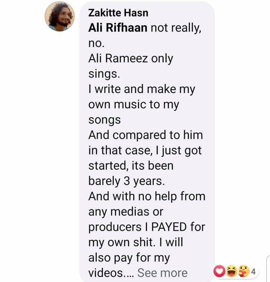 ޒަކިއްޓެ ބުނީ، އަލީ ރަމީޒް އަކީ ހަމަ އެކަނި ލަވަ ކީ ފަރާތެއްކަމަށެވެ. ނަމަވެސް އޭނާ އަކީ، ލަވަ ކިޔުމުގެ އިތުރުން އަމިއްލަ މިޔުޒިކް ހަދާ އެޔަށް ލަވަކިޔާ މީހެއް ކަމަށެވެ. އަދި އައްޔަ އާއި އަޅާކިޔާއިރު، އޭނަގެ 3 އަހަރުވީ މިޔުޒިކް ކެރިއާގައި މި ހިސާބަށް އައިސްފައިވަނީ، އެއްވެސް މީޑިއާއެއް އަދި މިޔުޒިކް ޕްރޮޑިއުސަރެއްގެ އެހީ އާއި ނުލާއި، އަމިއްލައަށް ޙަރަދުކޮށްގެން ކަމަށެވެ. މީގެ އިތުރުން، ޒަކިއްޓެ ވަނީ، މޯލްޑިވިއަން އައިޑަލް އިން ވިދާލި ތަރި ޝަލަބީގެ ލަވަކިޔުންވެސް އަލީ ރަމީޒްގެ ލަވަކިޔުމަށްވުރެ މާ މޮޅުކަމަށް ބުނެފައެވެ. މި ކޮމެންޓްތަކާއެކު، އައްޔަގެ ދިފާޢުގައި ނުކުތް ދިވެހިން އަނެއްކާވެސް ޒަކިއްޓެއަށް އިތުރަށް "ބަވަން" ފެށީއެވެ.