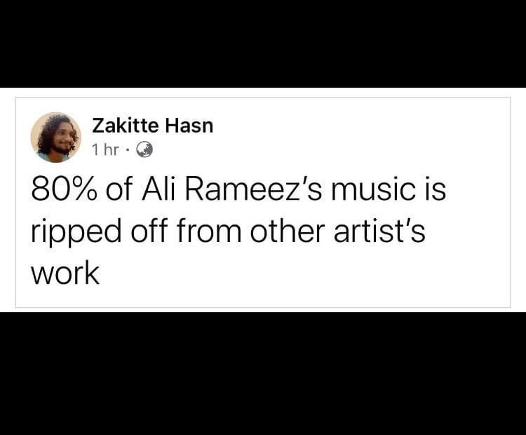 މިކަމެއް ފެށުނީ، ޒަކިއްޓެ އިއްޔެ އޭނަގެ ސޯޝަލް މީޑިއާގައި ޖެހި ސްޓޭޓަސް އަކާއި ހިސާބުންނެވެ. އިނގިރޭސި ބަހުން ޒަކިއްޓެ ލިޔެފައިވާ ސްޓޭޓަސްގައި އޭނަ ބުނީ، އަލީ ރަމީޒުގެ ލަވަތަކަކީ، 80 އިންސައްތަ އެހެން އާޓިސްޓުންގެ މަސައްކަތްތަކުން ކޮޕީކޮށްގެން އުފައްދާފައިވާ ލަވަތައް ކަމަށެވެ.