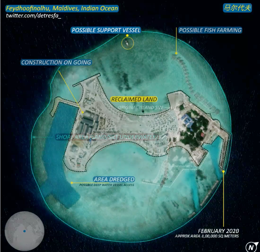 ބޭރުގެ ނޫހެއް ކަމަށްވާ "EurAsian Times އަދި ސައުތް އޭޝިއަން މޮނިޓަރ" ގައި ބުނެފައިވާގޮތުން އެންމެ ފަހުގެ ސެޓެލައިޓް ފޮޓޯ ތަކުން ފެންނަ ގޮތުގައި ފޭދޫ ފިނޮޅު ސައިޒުންވެސް މިހާރު ބޮޑުވަމުންދާ ކަމަށާއި ޗައިނާއިން ދަނީ ބާރު ސްޕީޑެއްގައި ފޭދޫ ފިނޮޅުގައި އަސްކަރީ މަރުކަޒެއް ގާއިމު ކުރަމުން ކަމަށް ބެލެވޭ ކަމަށެވެ.