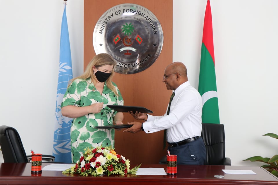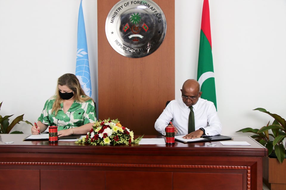 މިއަދު ހެނދުނު ފޮރިން މިނިސްޓްރީގައި ބޭއްވި ރަސްމިއްޔާތެއްގައި ދިވެހި ސަރުކާރުގެ ފަރާތުން މި ޑޮކިއުމެންޓްތަކުގައި ސޮއިކުރެއްވީ ފޮރިން މިނިސްޓަރ އަބްދުﷲ ޝާހިދެވެ. އަދި އދގެ ފަރާތުން ސޮއިކުރެއްވީ ދިވެހިރާއްޖޭގައި ހުންނަވާ އދގެ ރެޒިޑެންޓް ކޯޑިނޭޓަރ ކެތަރިން ހެސްވޯލް އެވެ.