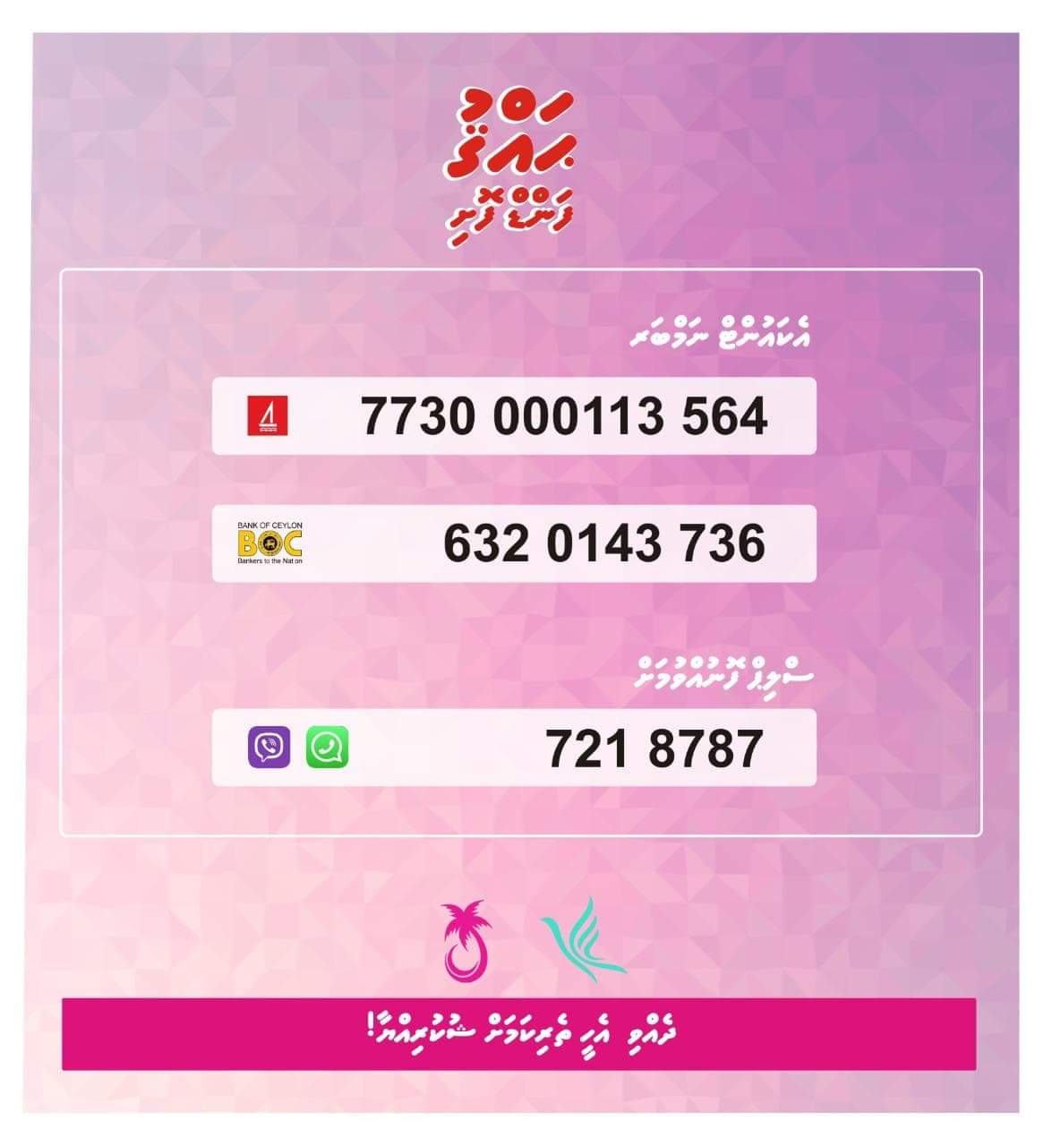 މި ނޫސްބަޔާނުގައި އިތުރަށް ބުނެފައިވަނީ ފައިސާ ޖަމާކުރުމަށްފަހު ސްލިޕްކޮޅު 7218787 އަށް ވައިބަރ ނުވަތަ ވަޓްސްއަޕް ކޮށްދެއްވުން އެދޭ ކަމަށެވެ.