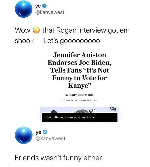 ކާންޔޭ މިހެން ބުނެފައިވަނީ، "ފްރެންޑްސް" ގައި "ރޭޗަލް" ގެ ކެރެކްޓަރ އަދާކުރި ކާމިޔާބު އެކްޓްރެސް ޖެނިފާ އެނިސްޓަން، ކާންޔޭއަށް ވޯޓު ނުލުމަށް އެމެރިކާގެ ރައްޔިތުންނަށް ގޮވާލުމާއި ގުޅިގެންނެވެ.