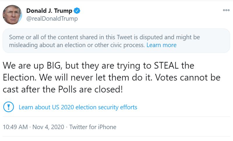 ޑޮނަލްޑް ޓްރަމްޕް މިއަދު ކުރެއްވި ޓްވީޓެއްގައި ވިދާޅުވީ، އިދިކޮޅު ފަރާތްތަކުން ވޯތު އޮޅުވާލަން މަސައްކަތް ކުރައްވާ ކަމަށާއި ނަމަވެސް ވޯޓު އޮޅުވާލިޔަކަށް ނުދެއްވާނެ ކަމަށެވެ. އަދި ވޯޓުލުމުގެ ވަގުތު ހަމަވުމަސްފަހު ވޯޓު ނުލެވޭނެ ކަމަށް ވިދާޅުވިއެވެ